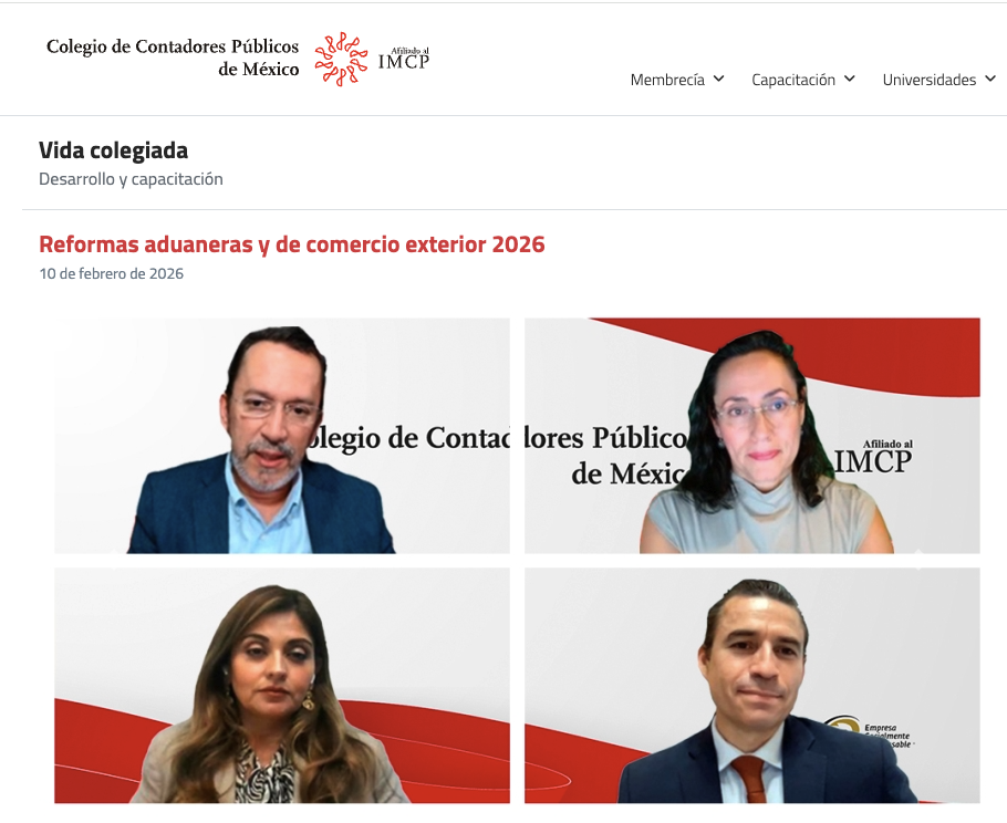 El pasado 10 de febrero la Dra. Gloria Estrada Antón y el Dr. Alberto Ruiz Rioja socios de esta Firma, participaron en el Foro de reformas aduaneras y de comercio exterior 2026 en el Colegio de Contadores Públicos de México.