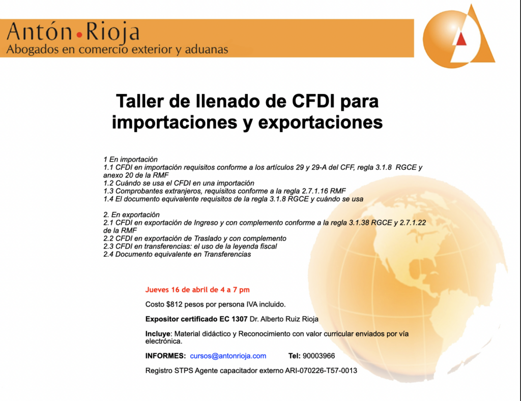 Taller de llenado de CFDI para importaciones y exportaciones | Apr 16 16:00