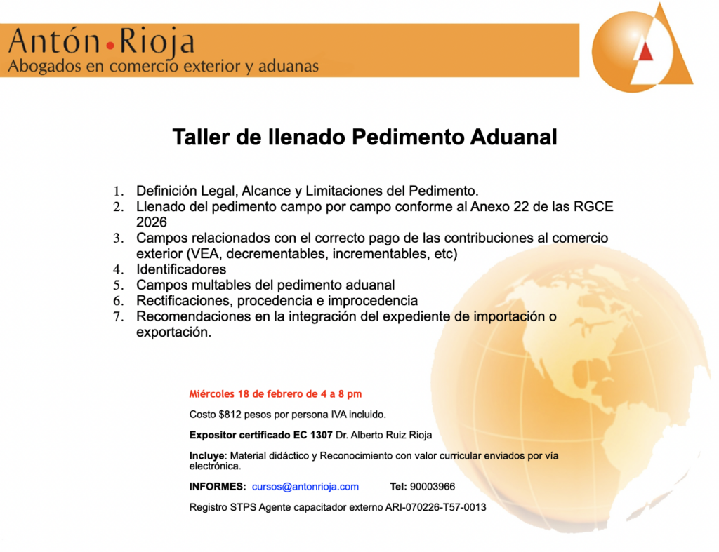 Taller de llenado de pedimento aduanal Anexo 22 RGCE 2026 | Feb 18 16:00