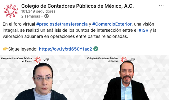 «Este 21 de enero, el Colegio presentó el foro virtual Precios de transferencia y comercio exterior, una visión integral, en el que se realizó un análisis de los puntos de intersección entre el Impuesto sobre la Renta (ISR) y la valoración aduanera en operaciones entre partes relacionadas. El evento fue presentado por Alberto Ruiz Rioja, Gloria Estrada Antón y Rosaura Aguilar Peña, integrantes de la comisión de Comercio Exterior.
